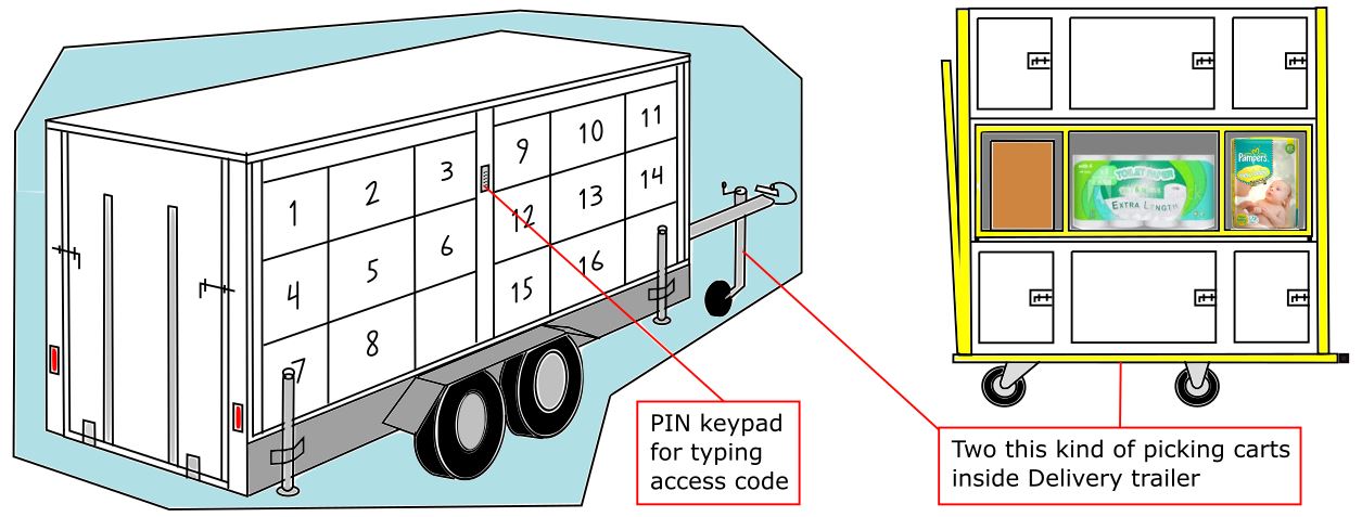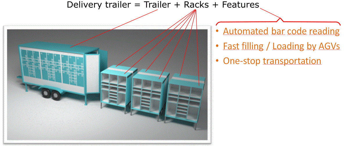A fundamental version of Delivery trailer comprises manually movable picking carts. The video in the above shows a version of automated loading in which loading of the trailer is performed by an automated guided vehicle (AGV).